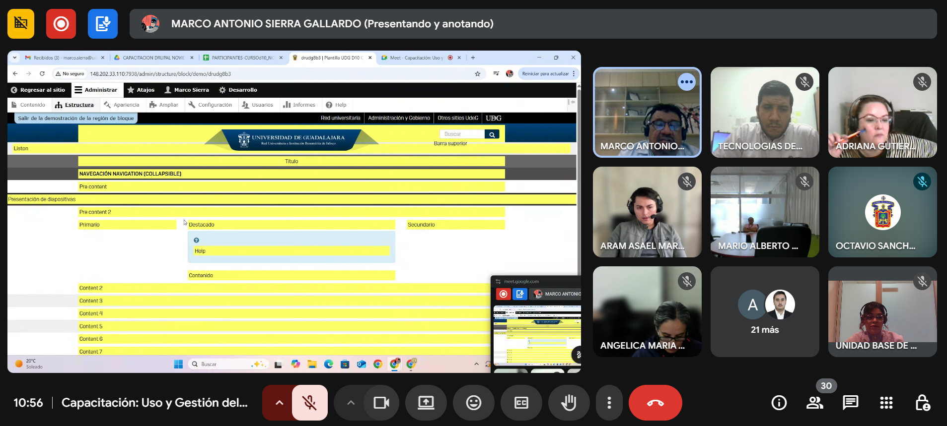 Entre los temas revisados en las sesiones se encuentran: la publicación de contenido en sitios web, el uso de bloques, creación de vistas y tareas de administración general del sitio. Se revisaron, además, los diferentes tipos de contenido disponibles en la plantilla del Modelo Web de la Universidad de Guadalajara y la aplicación de estilos con el uso de CSS, con la finalidad de sacar el mayor provecho a estas herramientas para la construcción de portales universitarios adecuados y accesibles para todas y todos.